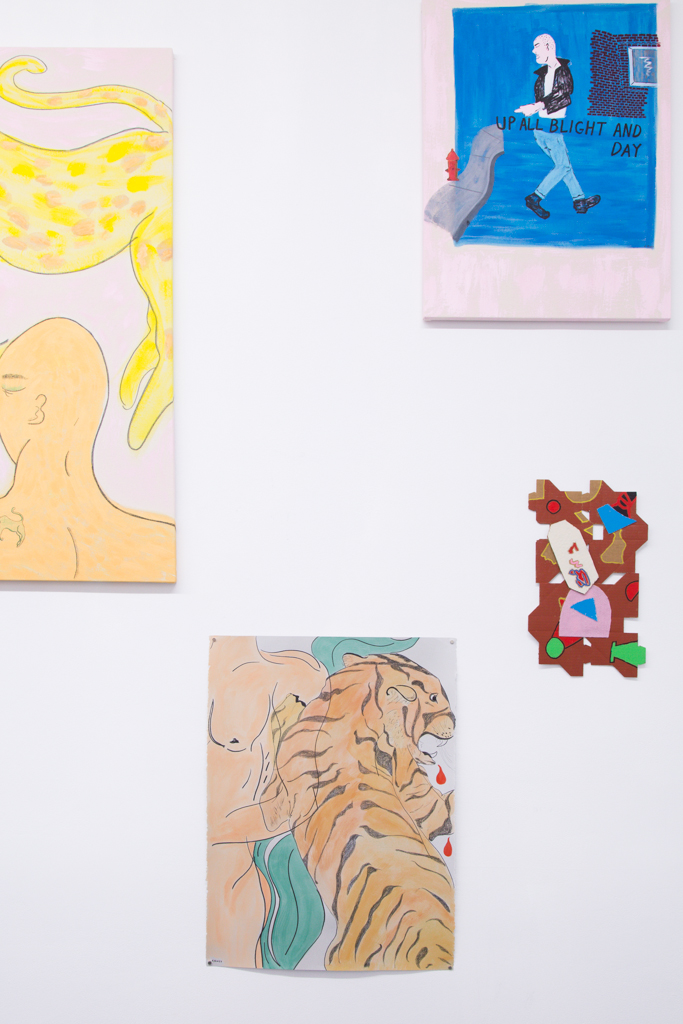 Jess Scott draws on her own personalized queer pantheon to produce paintings, drawings and sculptures that are at once scrappy, sexy and humorous. By studying, reinterpreting and combining images of wild creatures and male nudes (both abstracted notions for the artist), Scott unifies “objects of danger, pleasure and nature” to express what she sees as a kind of self-portraiture. Using a non-precious treatment of the materials and form, she questions identity as well as all aspects of “the gaze”. The cartoonish figures are made with a casual and confident hand. The anonymous faces and watery bodies of the nudes are hinted at while the more defined rockers of the demimonde pronounce the flirt, the dirt, the kink and the wink.