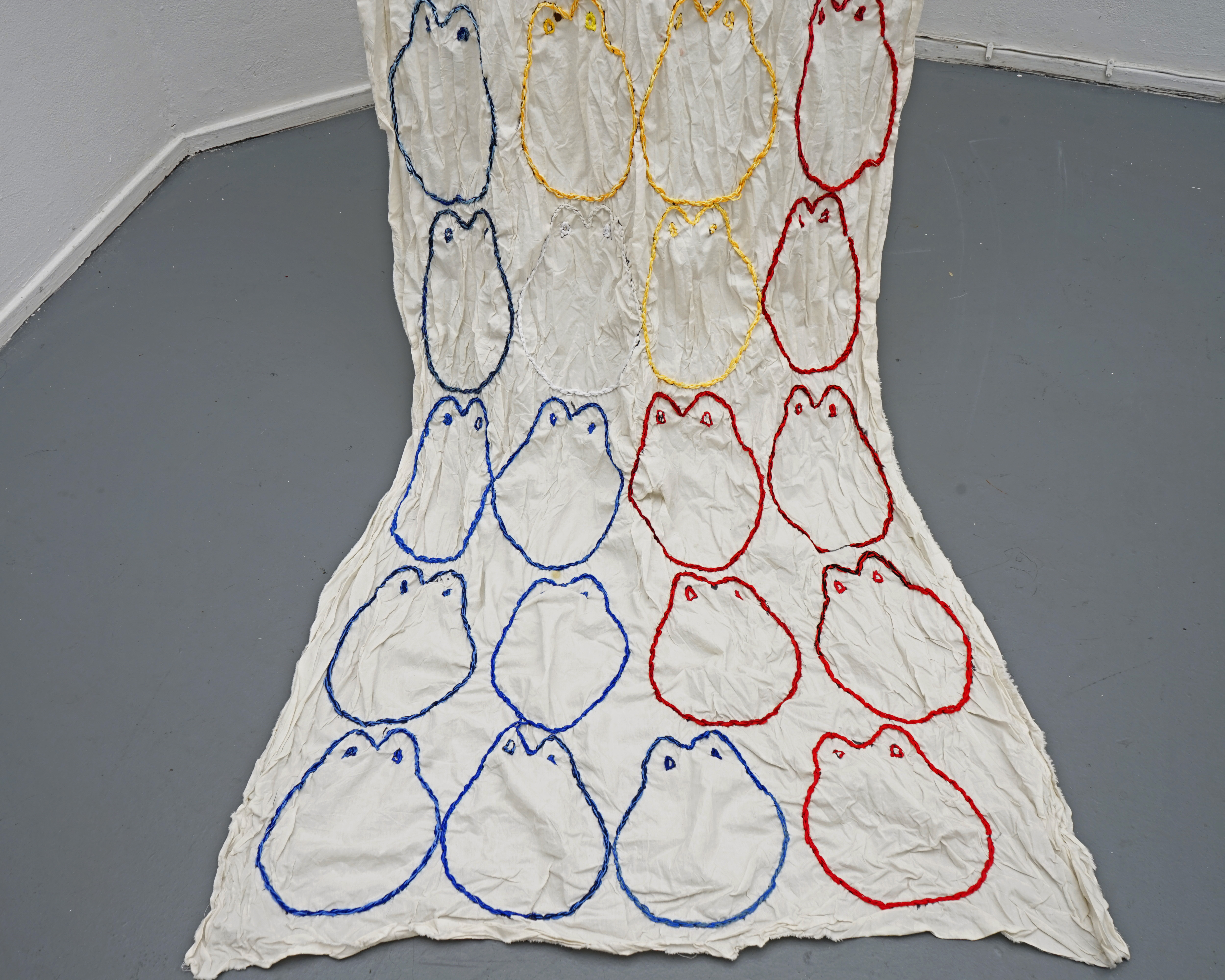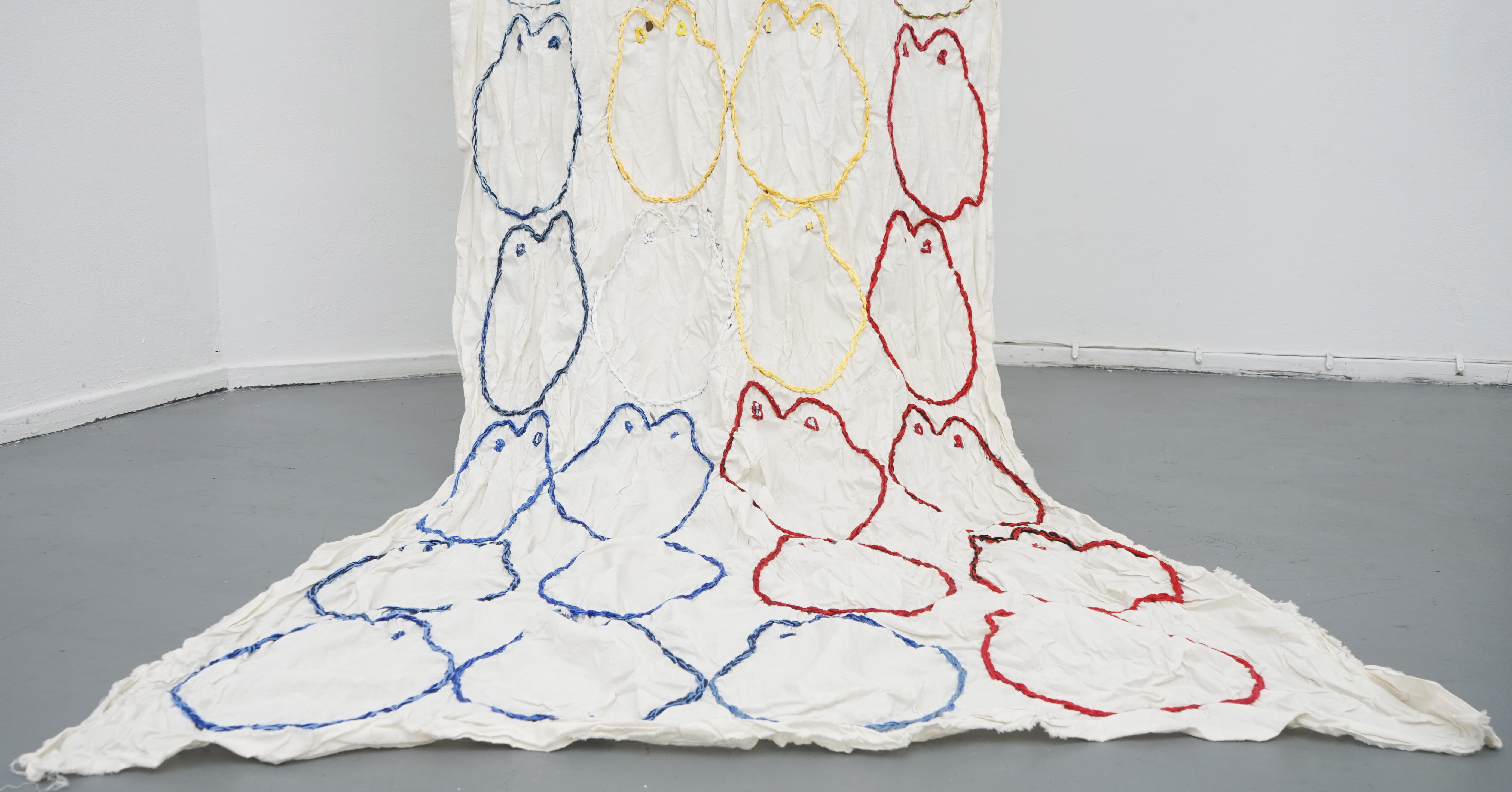 At the center of “island to URLand” is a recurring figure. Takashi created an icon that operates as an avatar of the Filipino diaspora. Simplified yet deeply layered, the figure echoes the logic of the emoji, the pictogram invented in 1999 by Japanese designer Shigetaka Kurita. Like the emoji, it is instantly recognizable. But beneath its surface lies a history of colonial erasure, embodying the contradictions of a community that has long been misrepresented or overlooked.