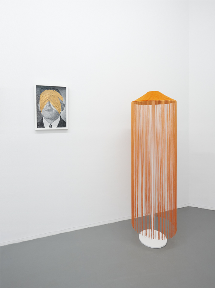Jaret Vadera, FIG. 387, Diseases of the Eye, 2017, mixed media, 19” x 13” and Erica Magrey, Swish, 2011, upholstery fabric, wire, fringe, 60” x 18” x 18”, photo credit Masaki Hori