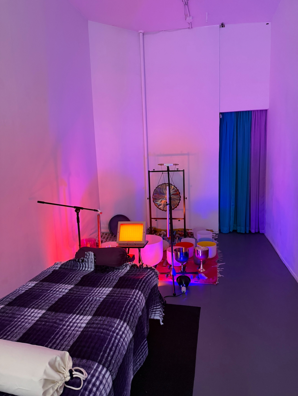 This project is part practitioner room, part art installation, all experiment. The front room features natural and colored lighting, a therapy table, and sound healing instruments including crystal singing bowls, Himalayan singing bowls, crystal harp, gong, chimes, and tuning forks. The back room offers a minimal video installation designed to relax and suspend time.
