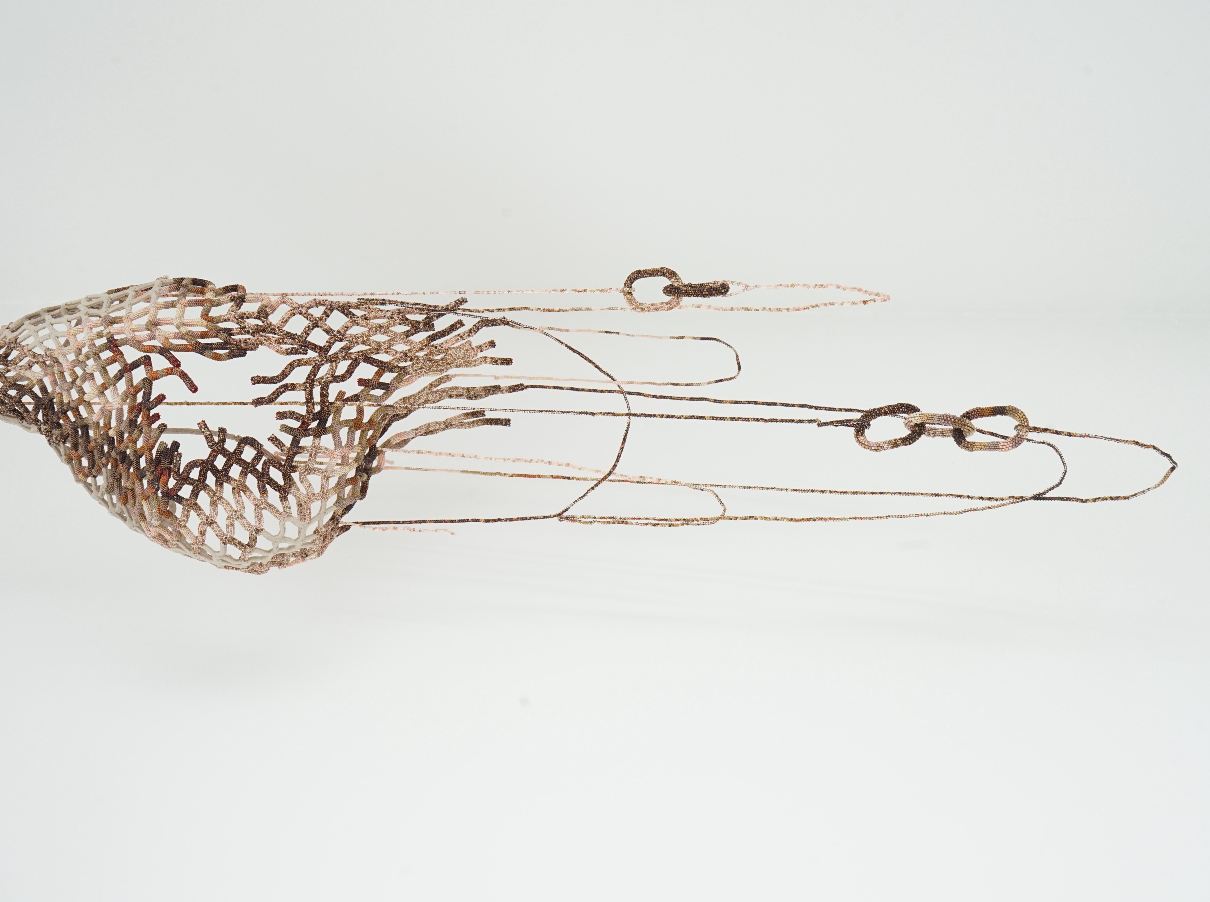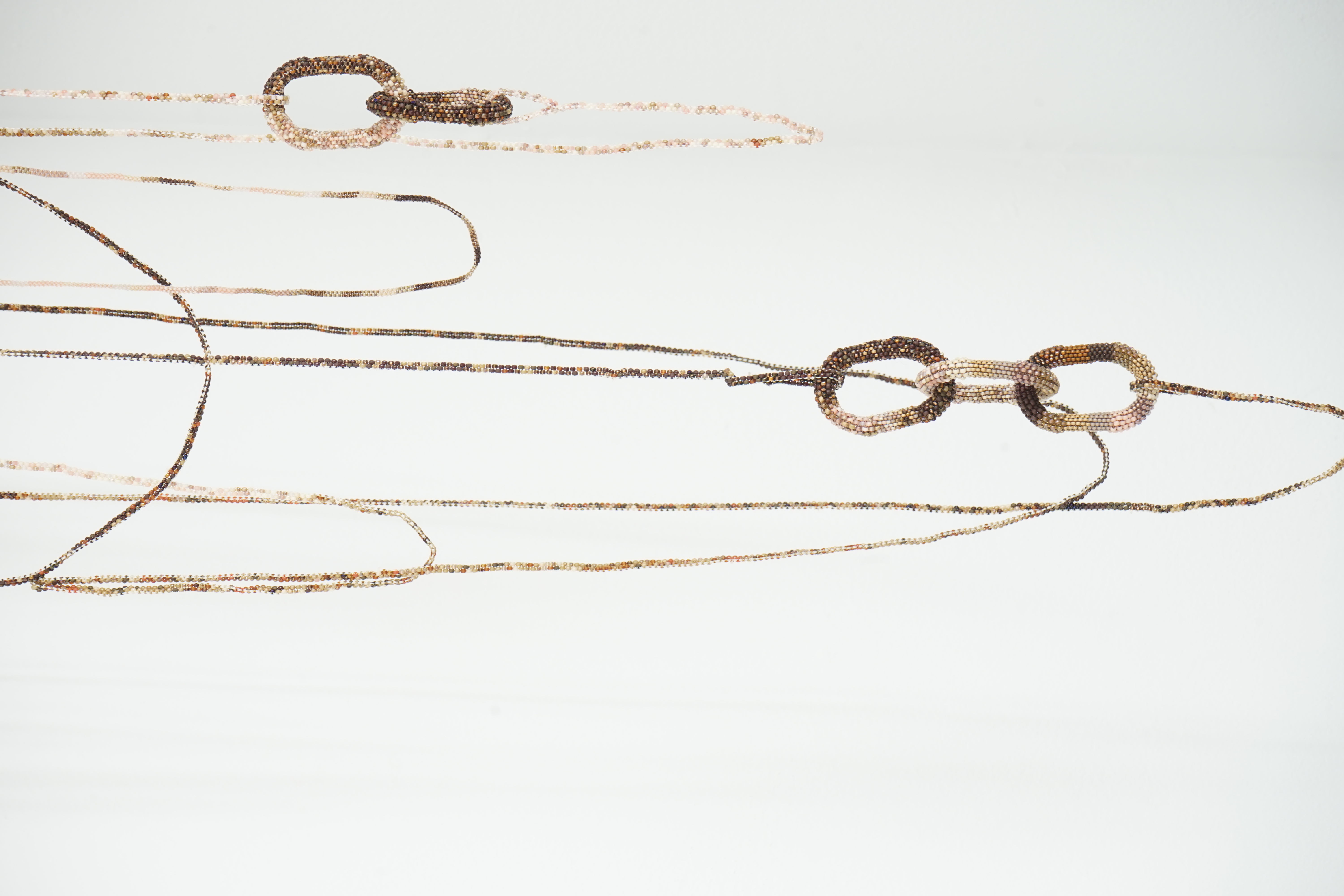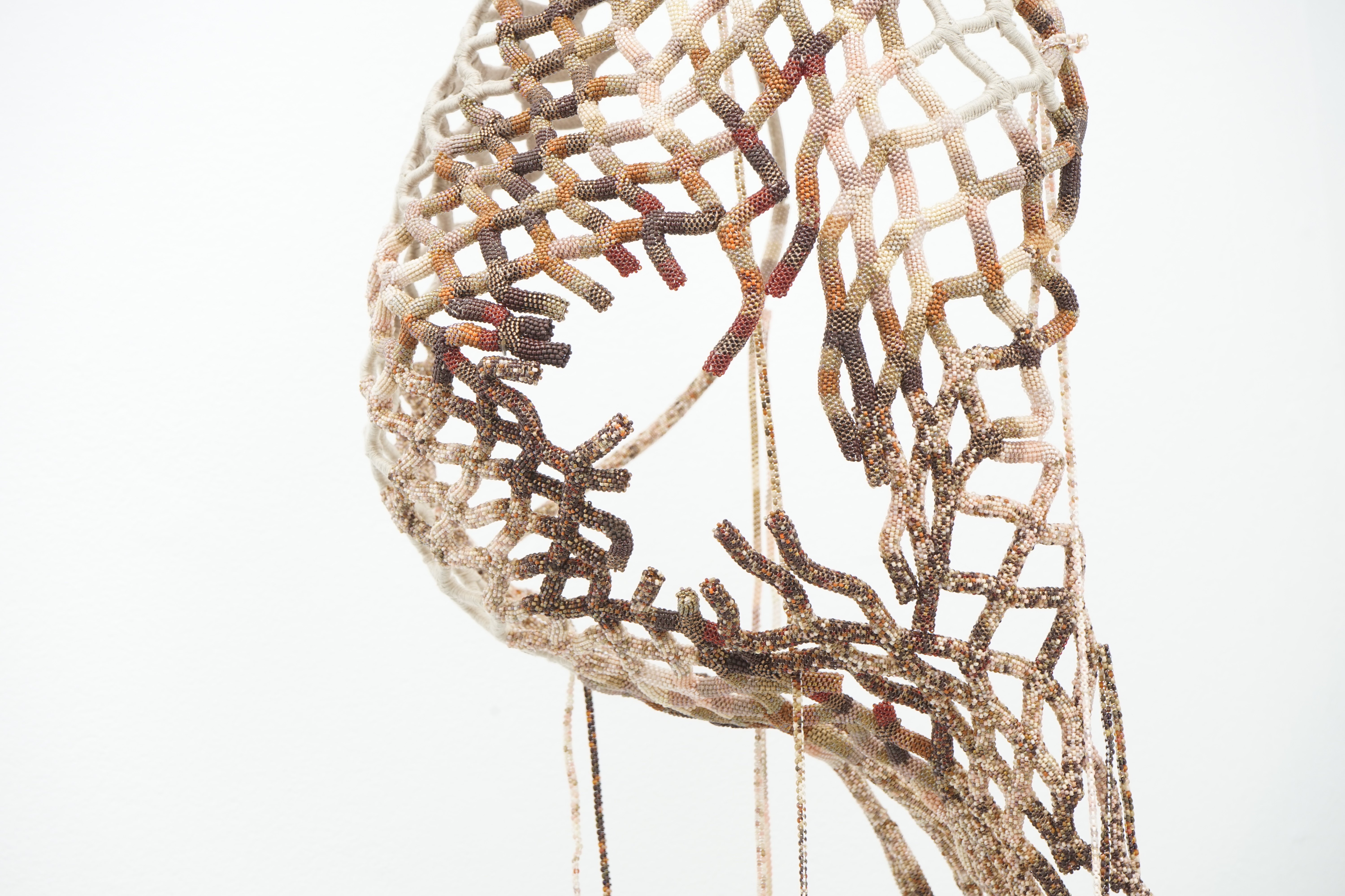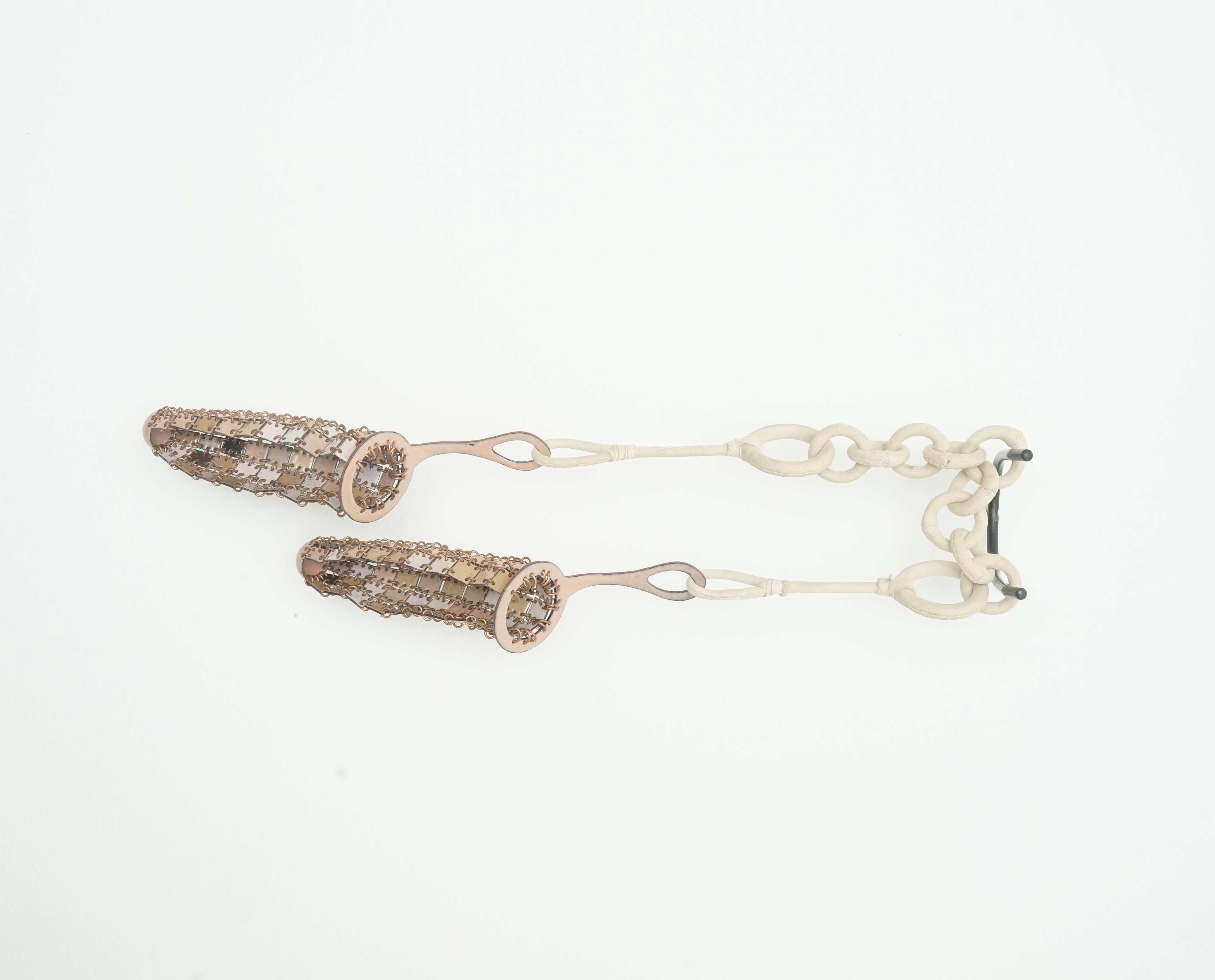 Soliven’s work subverts and utilizes object languages to speak to issues regarding intimacy, labor, grief, bodily autonomy, human rights, and women’s positionality within the patriarchal system — many works resulting in amalgamate forms of the censored body, medical implement, weapon, adornment, and trap. Censorship, much like our bodies, relations, and genders, may be weaponized. It has both the power to protect the privacy and humanity of those vulnerable to scrutiny and the power to render perverse and profane what ought not to be. The conflict presented in the pixelated censor is used broadly in her work and is interrogated through the tedium of craft practices — beading, weaving, paper crafts, metalsmithing, enameling, sewing — as a meditation on labor and the endless work needed to fight for what is ours.